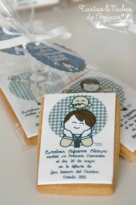 Aún faltan mas de tres meses para la Primera Comunión de mi hijo ...los vuestros también comulgan este año? La verdad es que aún no tengo nada preparado, aún hay tiempo. Por si andáis dándole vueltas al regalo para los invitados o queréis hacer un regalo a algún niño o niña que vaya a comulgar, os dejo unas ideas de algunas de las galletas decoradas que hicimos el año pasado Como esta parejita de niño y niña de Primera Comunión, galletas de mantequilla decoradas con fondant y detalles en glasa Para la Comunión de Iván hicimos una cesta de galletas con palito variadas, y para regalar a los mayores unos marineritos bastante parecidos a Iván A Pedro, un amigo de mi hijo, también le regalamos una cesta de galletas decoradas como estas por su Primera Comunión ...tuvieron mucho éxito! Y el angelito! Estoy segura que la mamá de Iván aún lo conserva con muchísimo cariño. Y de las cestas a los cubos: Este cubito se lo regalamos a Alejandro, con galletas variadas: flores, twister y globos, en azul y amrillo. La galelta decorada con papel impreso, así como las etiquetas son ilustraciones de Matilda Mota Bonitas verdad? Las galletas que vais a ver ahora están decoradas con papel de azúcar impreso y las ilustraciones son originales de Matilda Mota. Estos dos modelos son los "dulces recordatorios" de la Primera Comunión de Esteban, mi sobrino. Y estas son las de Carlota.Dejamos el papel de azúcar y pasamos de nuevo al fondant! Estas palomitas son las de Belén, que también tuvo galletas con su foto ...guapísima estaba! Una opción "ligth": unicamente con unas florecitas de fondant y el lacito ¡ojo! el lazo NO se come También hicimos florecitas con palito en tonos rosa Galletitas decoradas con Patchwork cutter y florecitas y piruletas de galleta alegres y coloridas. Como veis hay para todos los gustos! La semana que viene os quiero enseñar una linea nueva de Primera Comunión que estoy ultimando, seguro que os va a gustar mucho! ...pero no quiero adelantar nada aún, prefiero enseñároslo todo junto. Si habéis llegado hasta aquí os merecéis un premio jejeje! esta vez me he pasado con las fotos! Muchas gracias por la visita y hasta la próxima entrega "Comunionera" Pilar