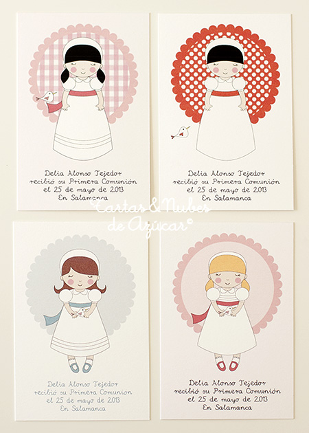 Ya tenéis aquí las fotos de los Recordatorios de Primera Comunión que os enseñé el lunes. Están ...¿imprimidos o impresos? nunca me aclaro, sobre un papel crema de alto gramaje. El rojo lleva el fondo del color del papel y los otros llevan un ligero tono rosado o azul dependiendo del modelo. Esta es mi preferida! ...el color del lazo no es tan "rechiscante" como parece :-(Al natural son mas bonitos aún! ...hoy no he estado muy inspirada con las fotos. Aquí tenéis los 4 modelos que os presentaba. Ya estamos haciendo las primeras personalizaciones!!! Además de rectangulares, también los podéis elegir formato cuadrado, o hacer vuestros Recordatorios de Primera Comunión en forma de marcapáginas ...o punto de lectura, con o sin lazo, como mas os guste! Conjunto de recordatorio y etiquetas de varios tamaños para los detalles de los invitados Os recuerdo que se puede escoger peinado, color de pelo, vestido largo, corto y color de fondo. Y si os apetece que os lo personalicemos también podemos hacerlo. Para mas información y pedidos: info.tartasynubes@gmail.com Gracias por la visita.Pilar