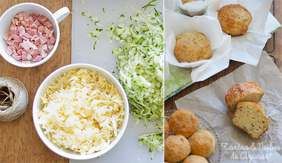 Muffins salados con verduras, queso y beicon, esta no es la única, pero es una de las poquísimas recetas saladas que aparecen en el blog, ¿recordáis el hornazo?. Ya sabéis que colaboro con la revista digital hosteleriasalamanca.es con recetas dulces. Sin embargo, la receta de este mes ha sido salada, estos deliciosos muffins, que son ideales tanto para un picoteo como para un picnic ...o para cuando mas os apetezca! Se pueden tomar templados o frios, acompañados con una ensalada o solos y podéis variar las verduras de la receta a vuestro gusto. Ya los he preparado con calabacín y con puerros ...y tengo ganas de hacerlos con albahaca fresca y tomates secados al sol, no sé qué tal estarán, pero me parece una combinación espectacular! Receta Para estas cantidades salen unas 15 unidades de muffins de tamaño grande (papeles del nº8). Ingredientes: 300 gr. de harina 300 ml buttermilk* 3 huevos tamaño M 100 gr. de mantequilla 1 cucharada de miel 2 cucharaditas de sal 2 cucharaditas de levadura1/2 cucharadita de bicarbonato sódico 300 gr. de calabacín** 100 gr, de beicon 100 gr. de queso *** Notas: *Para sustituir el buttermilk, podemos utilizar 250 ml de leche entera a la que añadiremos 2 cucharadas de zumo de limón. Lo dejaremos reposar durante 5 minutos antes de utilizarlo. **podemos utilizar, en vez de calabacín, 300 gr de puerro, limpio, cortado pequeñito y crudo. ***Podéis utilizar queso parmesano, manchego, semicurado, etc. Yo he utilizado un Cheddar curado. Medidas: 1 cucaharaditra: 5 ml 1 cucharada: 15 ml Preparación: Lo primero que vamos a hacer lavar y rallar el calabacín y lo colocarlo en un escurridor para que vaya soltando agua. Cortaremos también el beicon en pequeños dados y rallaremos el queso. Reservamos. Posteriormente mezclamos en un bol todos los ingredientes secos, esto es, la harina con la levadura, el bicarbonato y la sal. Y en otro bol iremos poniendo los ingredientes húmedos: batiremos los huevos ligeramente, añadiremos el buttermilk, la mantequilla fundida y la miel y batiremos con unas varillas hasta que estén bien mezclados. Ahora vamos a mezclar los ingredientes húmedos con los ingredientes secos, los iremos mezclando en dos o tres veces, con ayuda de unas varillas lo justo hasta que ambas mezclas estén integradas, pero sin batir en exceso, para que no pierda esponjosidad. Una vez tengamos toda la mezcla lista añadimos el calabacín, el beicon y el queso y lo integramos con suavidad a la masa. Ponemos esta masa en capsulas de papel para hornéalo, o si lo preferís, en moldes de silicona que previamente habréis engrasado. Los introducimos en el horno, precalentado a 180º, y los dejamos hornear durante unos 25 minutos, aproximadamente o hasta que veamos que pinchamos con una aguja y esta salga limpia. Dejamos enfriar o entibiar unos minutos sobre una rejilla Los podemos tomar tibios o frios. La receta está basada en ésta , de Silvia Trotamundos. Animaos a probar, os van a gustar! Gracias por la visita. Pilar