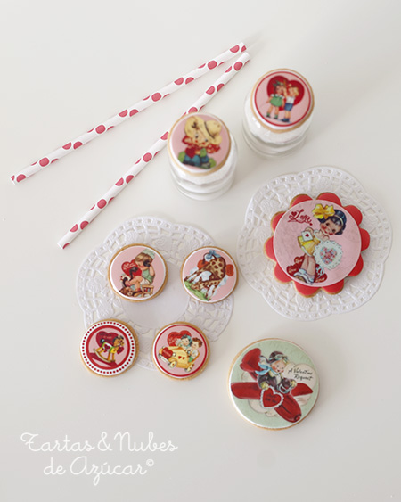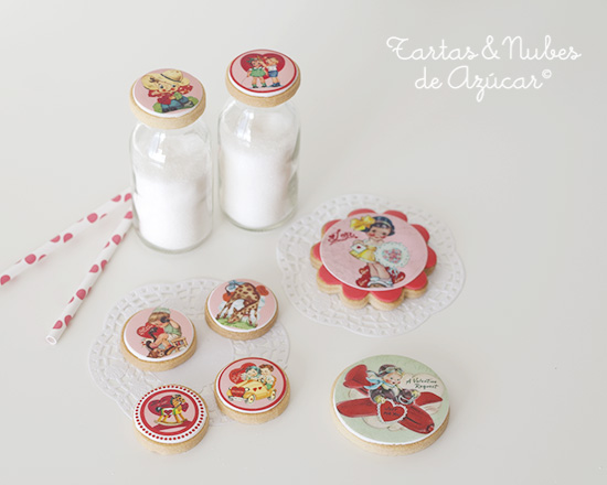 ...O galletas Sanvalentineras con ilustraciones "viejunas" Mira que me gustan este tipo de ilustraciones! Y lo preciosas que quedan impresas en papel de azúcar para decorar galletas! No es que sea para mi una fecha especial ni nada parecido, nunca lo hemos celebrado (ni vamos a empezar a hacerlo) ... peeeeeeeeeero, tanto corazón en Pinterest es lo que tiene, que te acaba apeteciendo decorar galletas "amorosas" ...empaquetarlas, ponerlas un lacito y regalárselas a alguien a quien quieras. Quien se va a resistir a una merienda con estas galletas? ¿No es una monada esta piruleta? ...Pues tengo mas galletas que enseñaros! Así que esta semana espero volver a veros por aquí! Aquí teneis la receta que yo utilizo para las galletas Y aquí un tutorial de Bakerella sobre como decorarlas con papel de azúcar impreso. Gracias por la visita y buena semana! Pilar