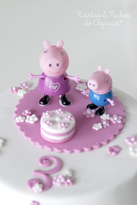 Antes de que el éspiritu "sanvalentinero" nos invada (me incluyo) y por la red no haya mas que corazones e imágenes amorosas os enseño la última tarta del 2.012. Pepa Pig y su hermanito George organizaron una fiesta, ...encima de mi tarta, para el cumpleaños de la pequeña Blanca. La tarta es sencilla, blanquita, ¡lo que me gusta una tarta blanca! y con algunos detalles en rosa. Me lo vais a preguntar, así que enseguida os saco de dudas: Pepa y George no están modelados en pasta de azúcar, son muñequitos articulados de plástico, venían montados en un tren, seguro que Blanca juega mucho con ellos. La cinta con cuadritos vichy NO se come jjjj, es de tela. Para la fiesta la tarta estaría coronada por una guirnalda, en la foto está detrás, pero para ver mas o menos el efecto vale ¿verdad? ...ummmmm el sabor no lo recuerdo ¿chocolate y fresa?. Qué cabeza la mía! debería apuntar las cosas para no olvidarlas! Felicidades Blanca!!!!!! Gracias por la visita, ...y también por el comentario si te apetece dejarlo! Pilar