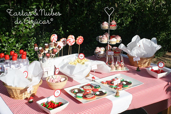 Me encantan los cumpleaños en los que está todo coordinado, desde las invitaciones hasta las servilletas. Ya sé que a algunos les puede parecer excesivo, pero rodearse de cosas bonitas no puede ser malo de ninguna de las maneras. Y lo que disfrutan los niños ...y las madres preparándolo, no tiene precio. En el cumpleaños de Carlota empezamos diseñando la papelería: invitaciones, toppers, etiquetas, las fajas de las botellas de agua, ... y hasta la etiqueta para el tarrito de mermelada casera de fresas que hizo la mamá de Carlota para regalar a las mamás sus invitados Cuando tuvimos clara la papelería, empezamos con todo lo demás: tarta, galletas, cupcakes, cakepops, nubepops.... La decoración de la tarta la realizamos a base de galletas, una caperucita muy sencilla, como la de la invitación, rodeada de flores y una placa con el nombre de Carlota. Las galletas, decoradas con los motivos de las etiquetas y las fajitas de las botellas de agua, caperucita y cesta. Todas las galletas de Caperucita están cortadas a mano ayudándonos de una plantilla. La receta de las galletas de mantequilla que utilizo siempre la tenéis aquí. También hubo cupcakes de vainilla decorados con fondant Y otros decorados con swiss merengue buttercream de fesa, la base, receta de Lara, del blog Tartacadabra, clic aquí. La crema de fresa, del rincón de Bea, clic aquí. Creo recordar que la tarta era de los mismos sabores y recetas que los cupcakes ...pero puede que me equivoque. Y así de bonita dejó Anna la mesa del cumpleaños de su pequeña Carlota. ...y los regalitos que se llevaron los invitados a la fiesta y sus mamás. ¿No quedó todo precioso? Espero que os guste. Gracias por pasar por aquí. Pilar