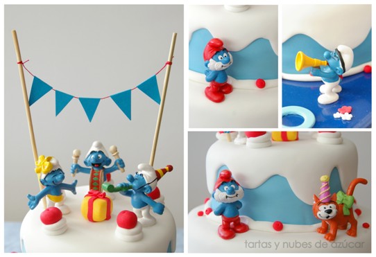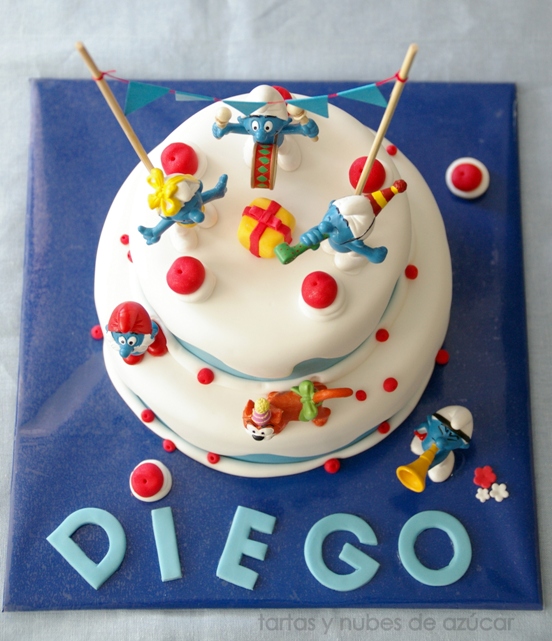 Estos pequeñajos azules se montaron una fiesta por todo lo alto en la tarta de cumpleaños de Diego A la mamá del cumpleañero y a mí nos gustaba la idea de hacer una tarta "tarta" y que los Pitufos la invadieran La tarta de chocolate ...creo recordar, decorada con fondant, guirnalda y unos divertidos Pitufos, de plástico, ...que yo no modelo así de bien ¡qué mas quisiera! A Diego le encantó, y a mí me encantó hacerla ¿qué mas se puede pedir? Espero que a vosotros también os guste! Gracias por la visita y buena semana ....la última de cole para muchos!Pilar
