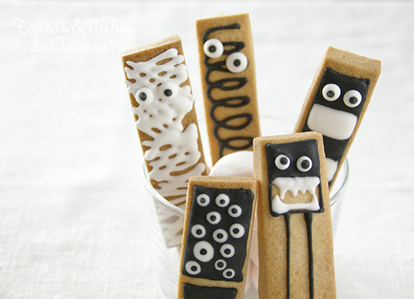 Cuando hace un par de días vi en la pagina de Facebook de Morgana, La Tartienda estas galletas tuve la necesidad de hacerlas. Tenía masa de galletas, glasa preparada ...y muchas ganas. Así que en un rato tenía estos montruitos repartidos por la mesa de mi cocina, ...mirandome ...y a mis hijos también! pero ellos deseando que les hiciera las fotos ¡YA! para poder hincarlas el diente Una merinda terrorífica la de este viernes! No son perfectas, ni mucho menos, pero ...son monstruos! tampoco lo necesitan!!!! Me divertí muchísimo haciendolas, y me encantan!!!!! Pasad un estupendo fin de semana. Gracias por la visita. Pilar