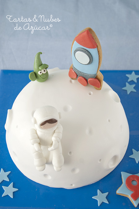 Mi hijo Eduardo cumplió nueve añazos en febrero, parece mentira como pasa el tiempo! Si hace nada era un bebé redondito y tranquilote! Tuvimos la suerte de que hizo un día estupendo y lo celebramos al aire libre, y con disfraces, aprovechamos que había sido carnaval hacía pocos días. La tarta "de dos chocolates", por deseo expreso del cumpleañero. ...Y lunar, porque el disfraz que le hicimos para Carnaval era de Astronauta y la tarta debía "ir a juego". Ya sabéis, los niños tienen fases en los que les da por un tema y se obsesionan. No quiero ni acordarme de la guerra que me dio el astronauta! (modelado con pasta para modelar Ballina) ...patilargo, bracicorto, cabezón, arggggg! Pero acabo saliendo! y aún lo tenemos en casa, está sentado en la base de la bola del mundo que tiene Eduardo en su habitación. Nos costó salvarlo, todos los niños del cumple querían hincarle el diente! ...el pobre alienigena verde no tuvo tanta suerte Espero que os guste! Recordaros que podeis seguir votando por mi blog para los Premios HosteleriaSalamanca.esen el siguiente enlace: Clic aquí.Gracias! Pilar