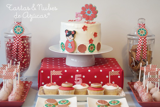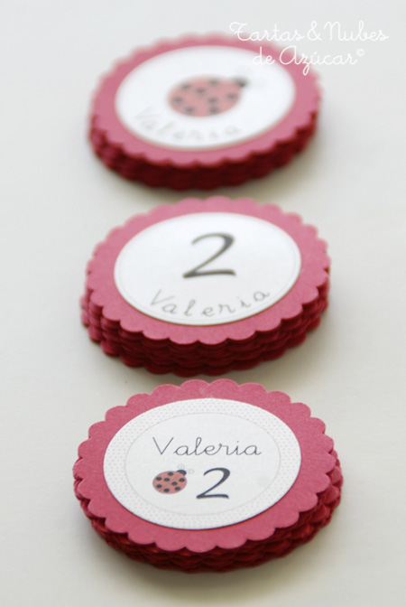 Hace poco fué el 2º cumpleaños de Valeria, y su mamá se puso en contacto conmigo para que le ayudara con algunos temas de la decoración de la fiesta. Yo me encargué de la papelería (invitaciones, etiquetas para las botellas, tarjetitas, toppers, etc) y de las galletas. Tenía ganas de hacer algo así, coordinar papelería y dulces, esta fué la primera vez y me encantó hacerlo.Y mira por donde, unos pocos días después tuve la oportunidad de repetir la experiencia para otro cumpleaños. etiquetas para los detalles de los invitados ... galletitas de chocolate Hasta Madrid se fueron etiquetas y toppers acompañando a estas flores y un montón de mariquitas, que junto con todo lo que había preparado la mamá de Valeria, dieron como resultado una fiesta estupenda y una mesa así de bonita. En breve os enseñaré mas " Kits" de fiesta personalizados y si estáis interesados en adquirirlos, tanto para imprimir y montarlos vosotros mismos como para recibirlos ya montados podéis poneros en contacto conmigo a través de la siguiente dirección: info.tartasynubes@gmail.com Gracias por la visita y buena semana. Pilar